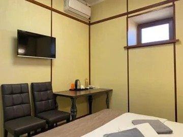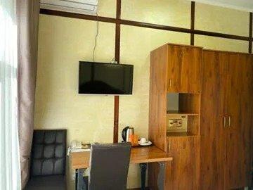 В номере имеется: двуспальная 180*200, прикроватные тумбы, гардеробный шкаф с зеркалом, пенал, багажная полка, стол, стулья, холодильник, система внутренний связи(мини атс), электрочайник, набор чайной посуды, сейф, ночной бра, фен, телевизор, кондиционер, санузел с душевой кабиной.