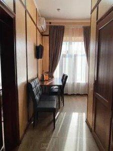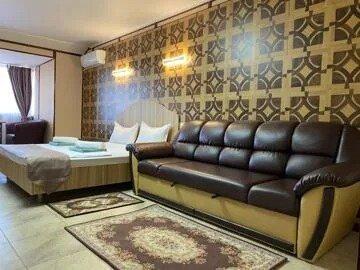 Номера класса Lux меблированы гарнитурами премиум: кожаной и мягкой мебелью.