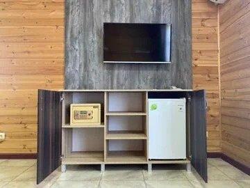 В номере имеется: двуспальная 180*200 кровать, двухъярусная кровать 100*200 , прикроватные тумбы, гардеробный шкаф с зеркалом, пенал, багажная полка, стол, стулья, холодильник, система внутренний связи (мини атс), электрочайник, сейф, набор чайной посуды, фен, телевизор в каждой комнате, кондиционер в каждой комнате, ночной бра, санузел с душевой кабиной.