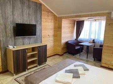 Отдельно стоящий двухместный двухкомнатный номер с террасой. В номере имеется: двуспальная 180*200 кровать, две односпальные кровати кожаная софа, прикроватные тумбы, гардеробный шкаф с зеркалом, пенал, багажная полка, стол, стулья, холодильник, система внутренний связи(мини атс), электрочайник, сейф, набор чайной посуды, фен, телевизор в каждой комнате, кондиционер в каждой комнате, ночной бра, ), полотенца, ванные принадлежности, санузел с душевой кабиной. Дополнительное место предусмотрено . Площадь номера ~50 кв.м., площадь террасы 13,5 кв.м.