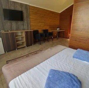Отдельно стоящий трехкомнатный четырехместный номер с террасой. В номере имеется: две односпальные 90*200 и двуспальная 180*200 кровать, прикроватные тумбы, гардеробный шкаф, багажная полка, холодильник, фен, отдельная кухня, электрочайник, набор столовой и чайной посуды, 2ТV, два санузла, один санузел с душевой кабиной, второй- унитаз, умывальник.