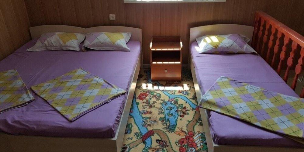 Двухэтажный 3-х комнатный номер с балконом. В номере: 8 кроватей, большой холодильник, столы и стулья, тумбочки, телевизоры, шкаф для одежды, москитная сетка, кондиционер, диван и кресла. Один санузел и душ на первом этаже. Номер очень просторный и большой. Для доп мест можем предоставить по наличию отдельные кровати и/или обычные артопедические пружинные матрацы толщиной 20 см. Площадь: 75 кв. м
