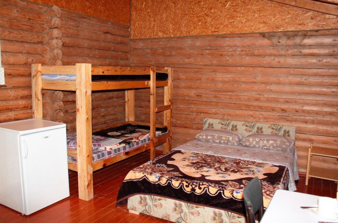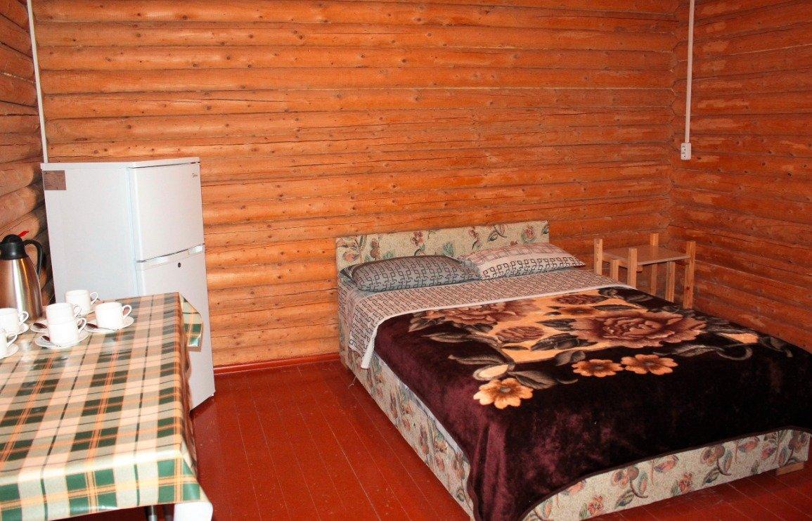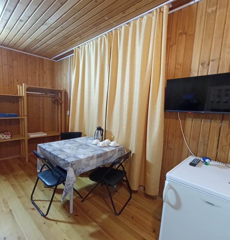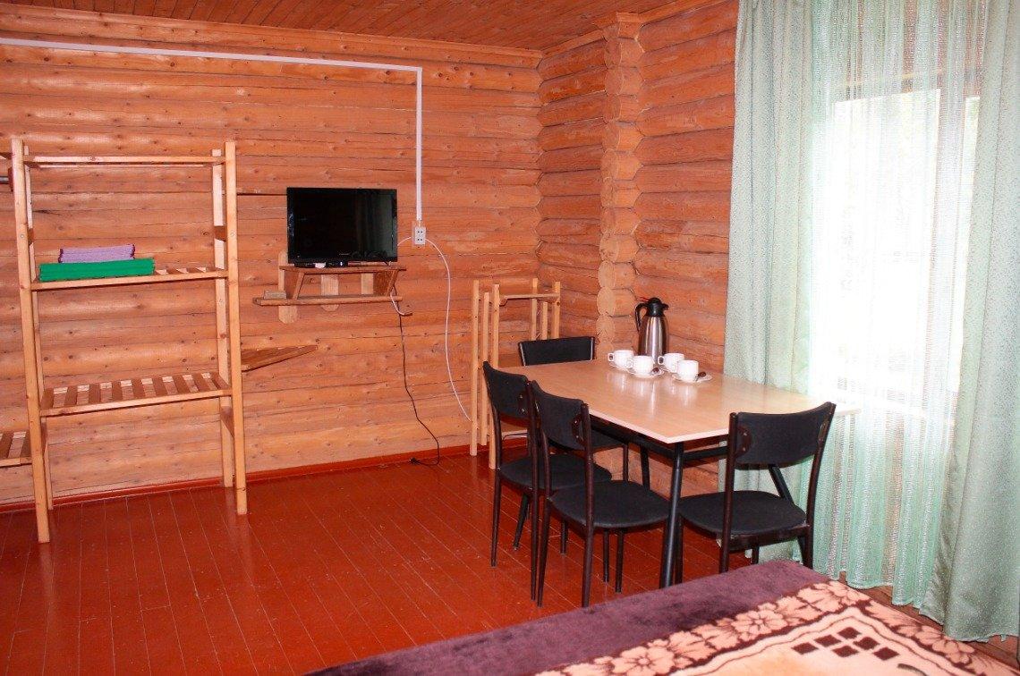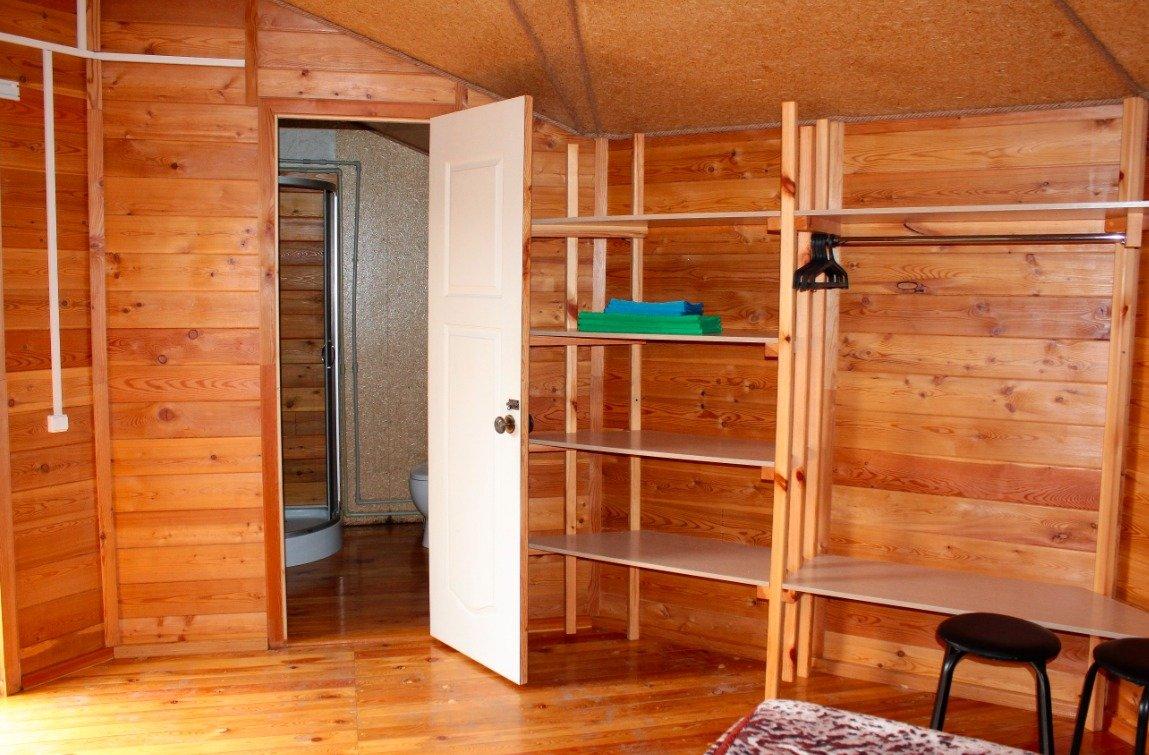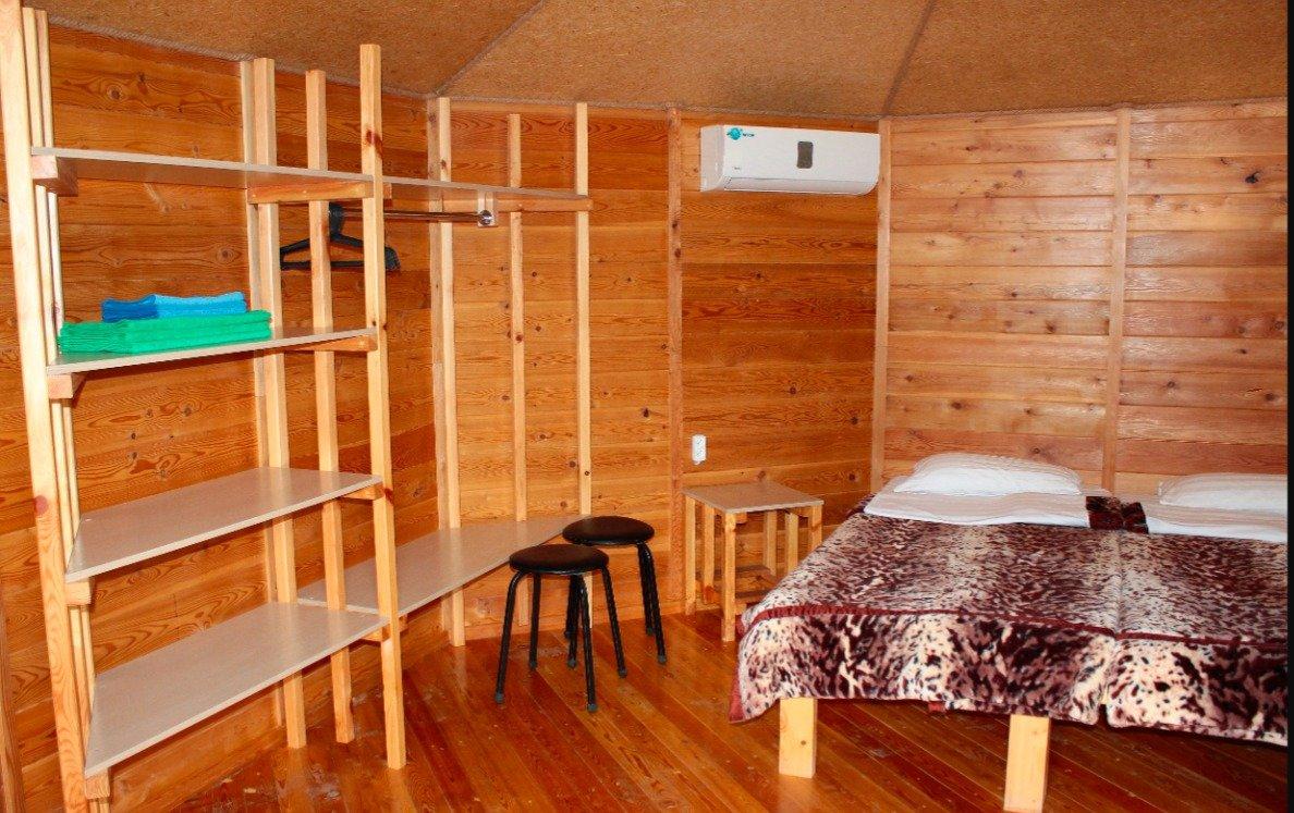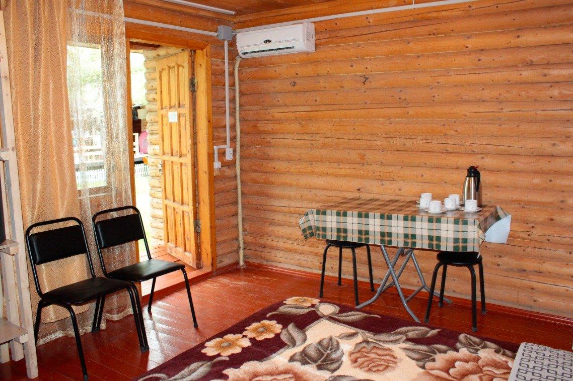 Однокомнатный 4-х местный номер в общем корпусе-срубе, без террасы. В номере двуспальная и двухъярусная кровати, холодильник, кондиционер, ТВ, тумба, стол, стулья, набор чайной посуды, термос, шкаф-стеллаж, собственный санузел с душем с отдельным входом на небольшой веранде.