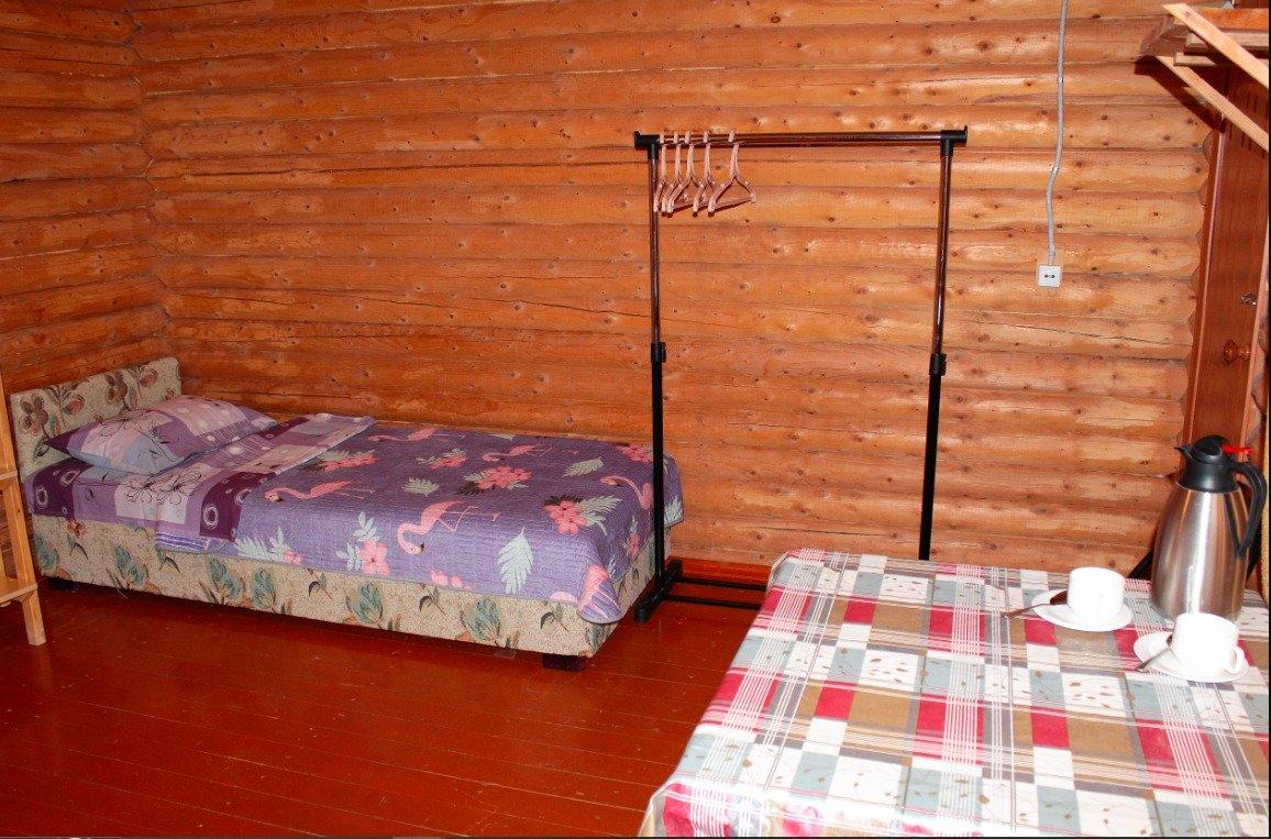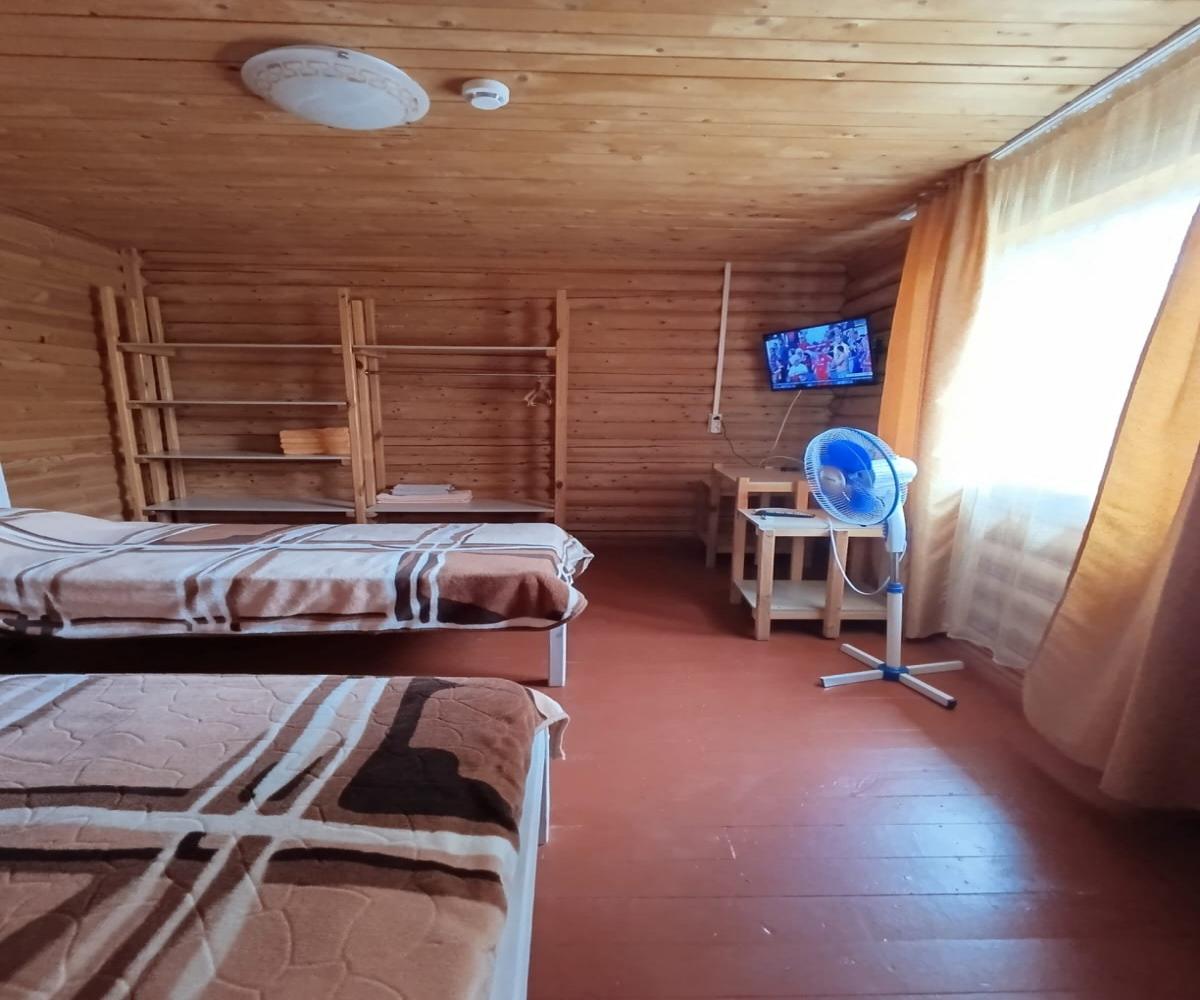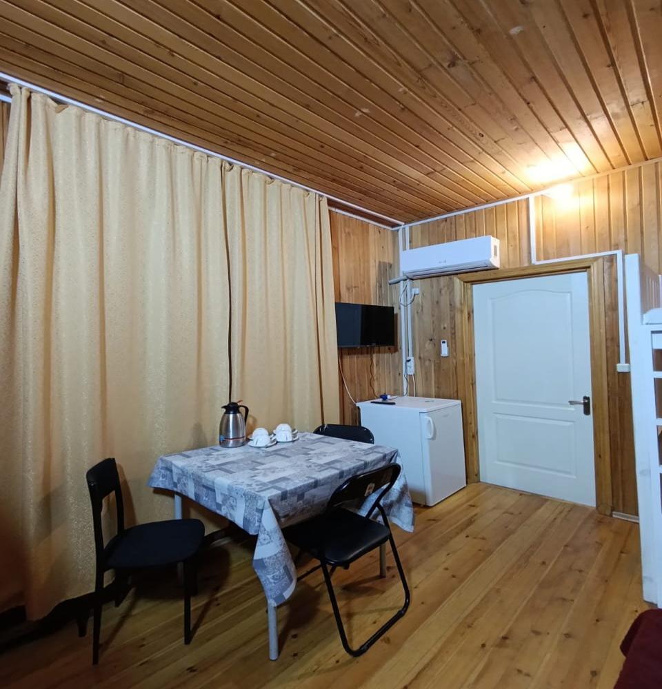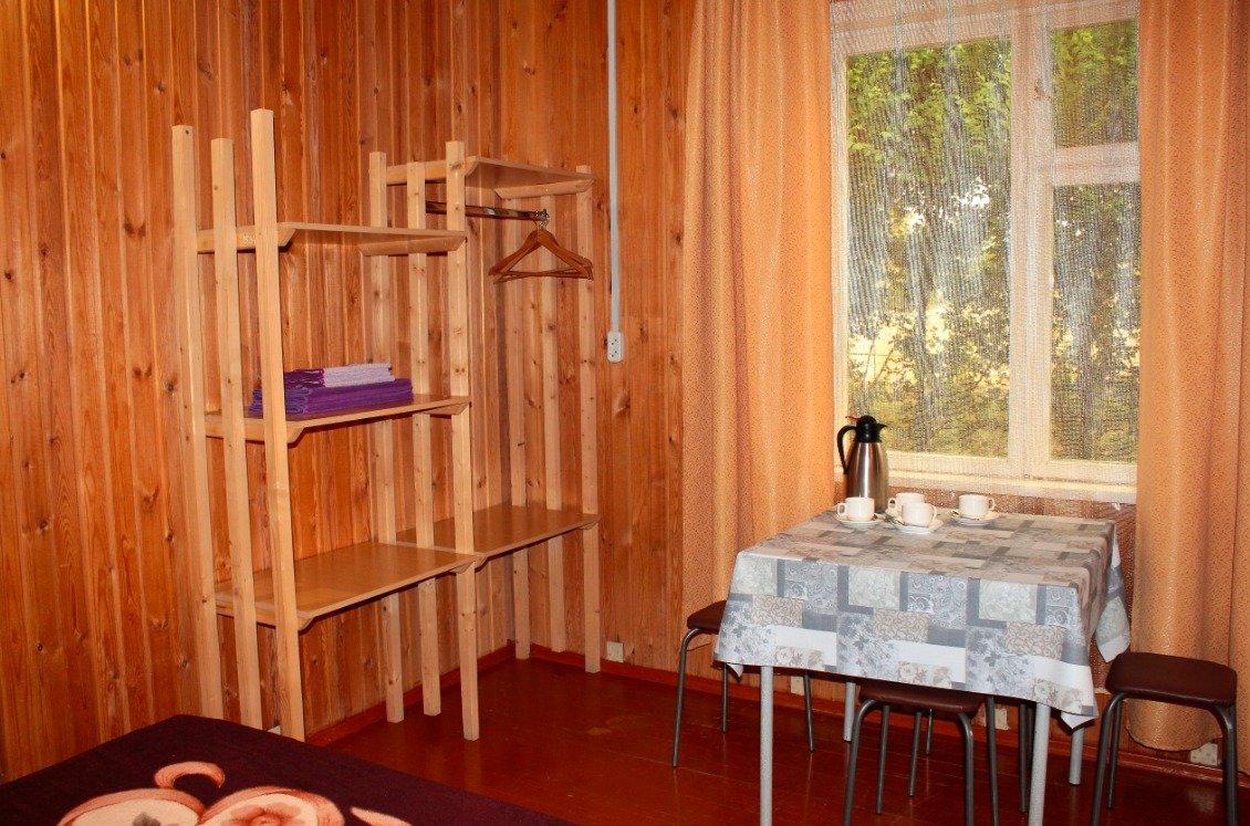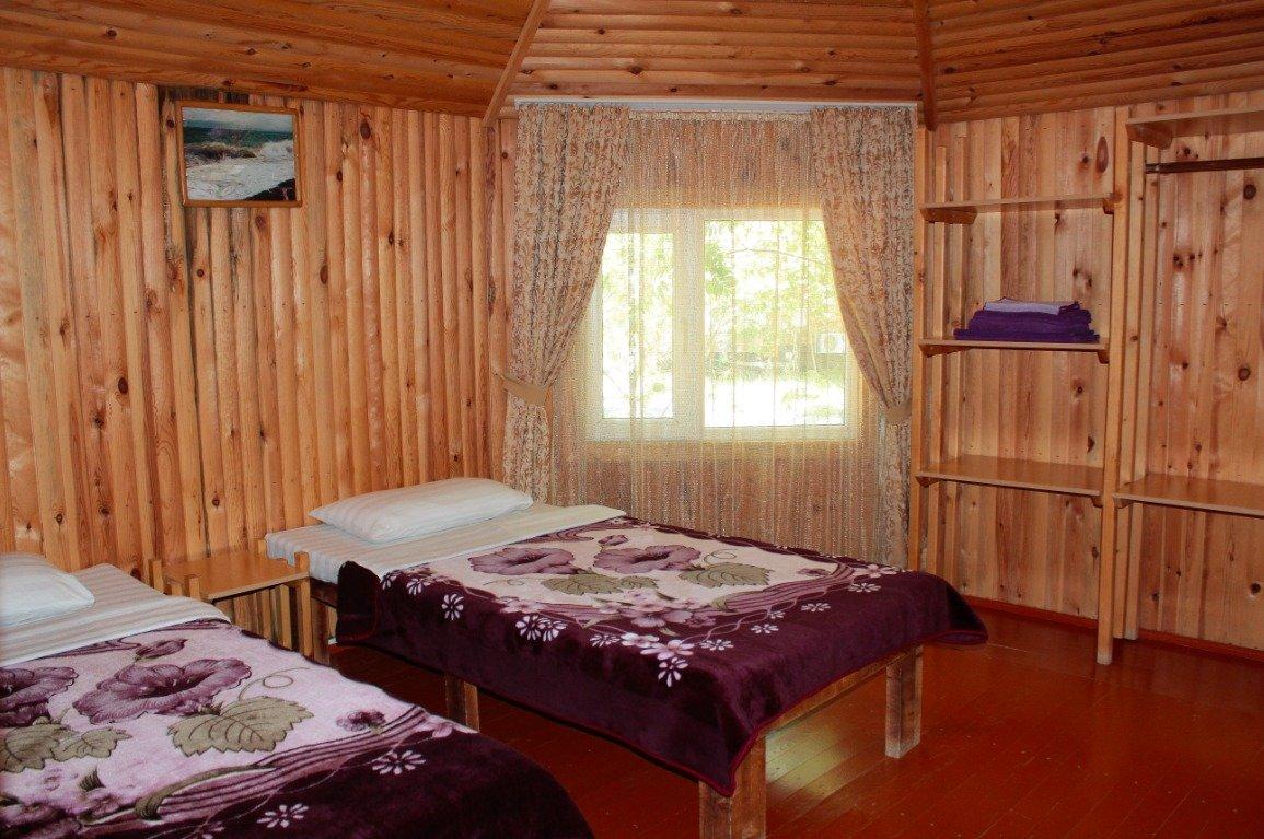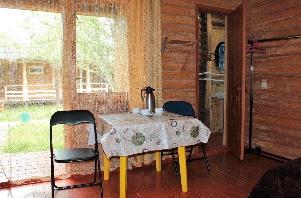 Однокомнатный 4-х местный номер в общем корпусе-срубе, без террасы. В номере двуспальная и двухъярусная кровати, холодильник, кондиционер, ТВ, тумба, стол, стулья, набор чайной посуды, термос, шкаф-стеллаж, собственный санузел с душем с отдельным входом на небольшой веранде.