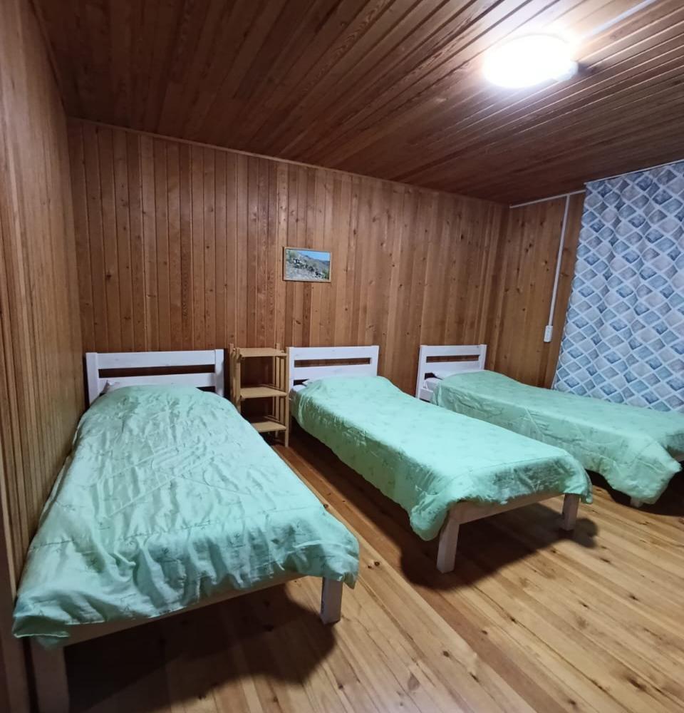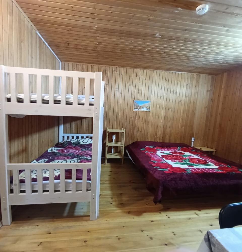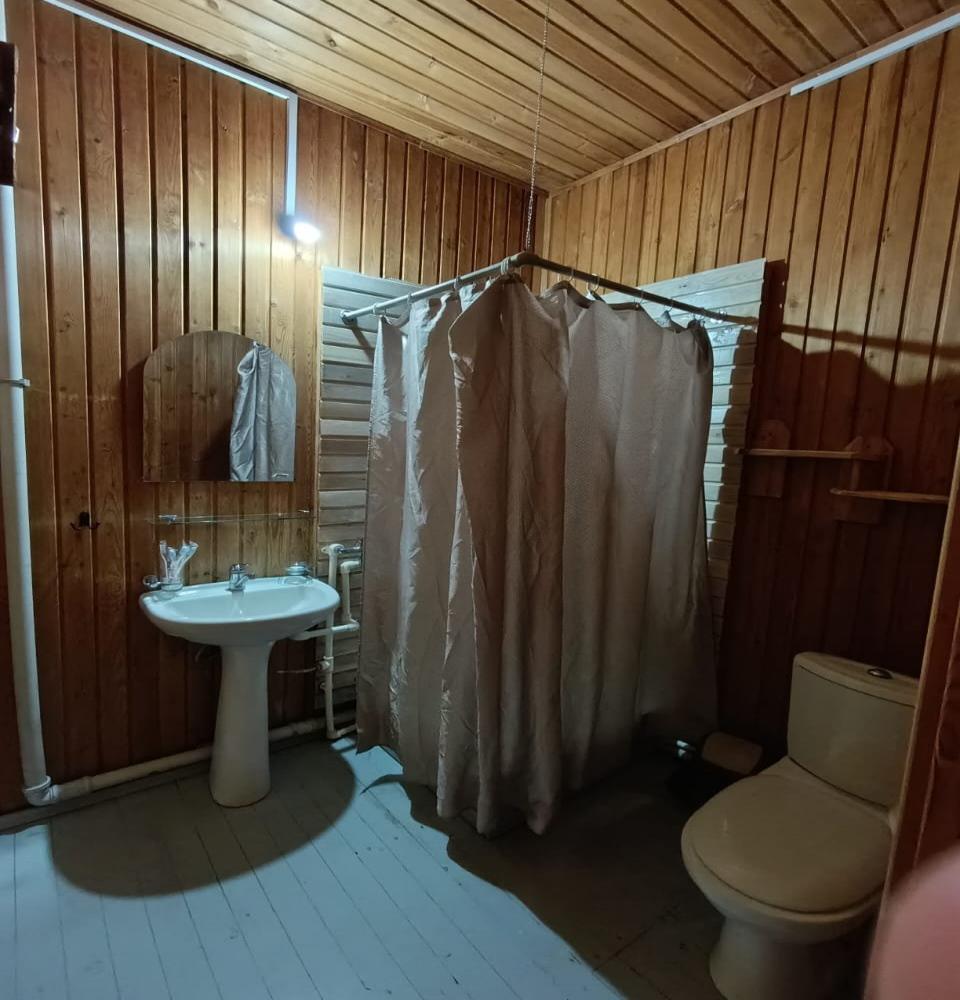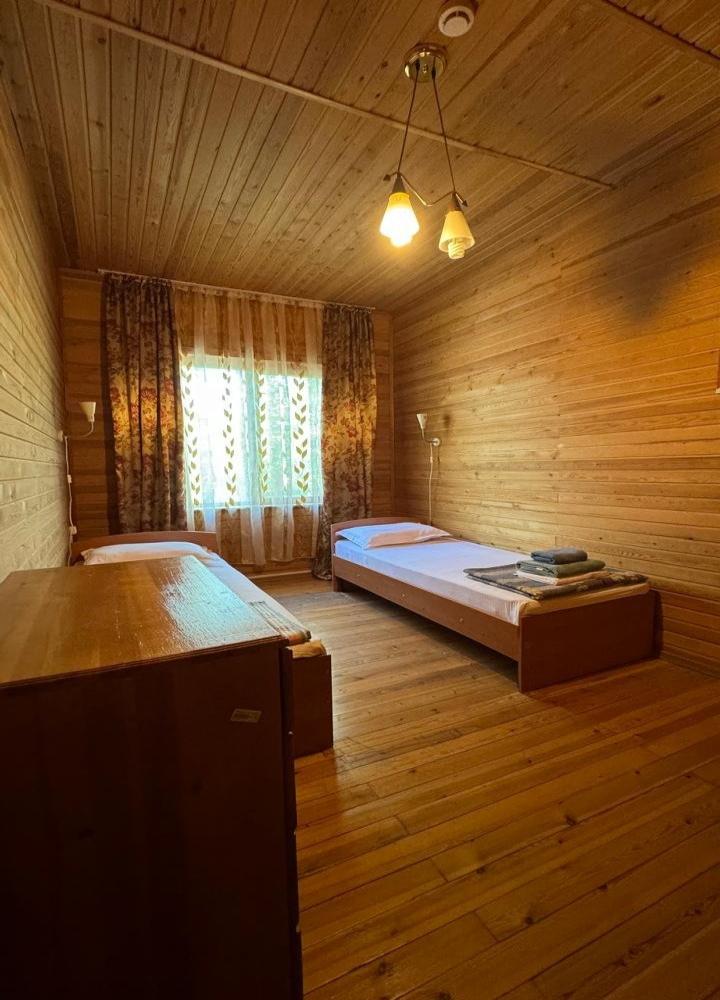 Двухкомнатный 5-ти местный номер в общем корпусе-срубе. В номере в первой комнате двуспальная и односпальная кровати, во второй- двуспальная кровать, стол, стулья, тумба, набор чайной посуды, термос, вентилятор, мини-холодильник, санузел с душем на номер.