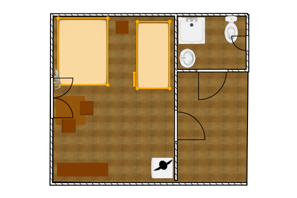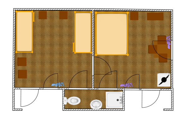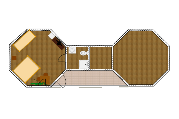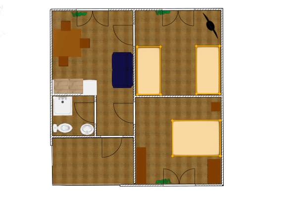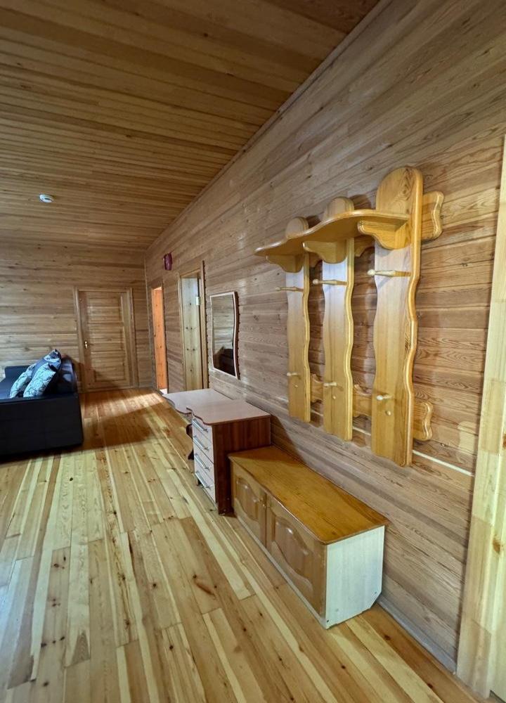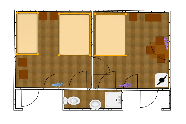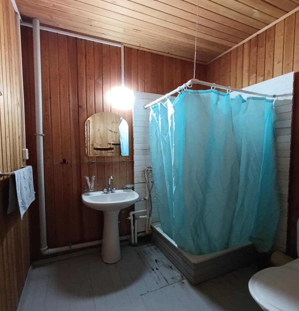 Двухкомнатный 5-ти местный номер в общем корпусе-срубе. В номере в первой комнате двуспальная и односпальная кровати, во второй- двуспальная кровать, стол, стулья, тумба, набор чайной посуды, термос, вентилятор, мини-холодильник, санузел с душем на номер.