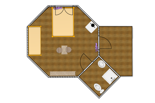 Отдельно стоящий дом. Двухкомнатный 2-х местный номер (спальня, гостиная). В номере: Спальня — двуспальная кровать, комод, шкаф-стеллаж; Гостиная : угловой диван, холодильник, ТВ, кухонный гарнитур, СВЧ- печь, набор столовой и чайной посуды, эл/чайник, кондиционер; Санузел- душевая кабина, джакузи. В номере уютная терраса. В гостиной с мягкой мебелью можно организовать 2 доп. место по 7 000 тенге в сутки за каждое доп. место. Площадь номера — 58 кв.м.