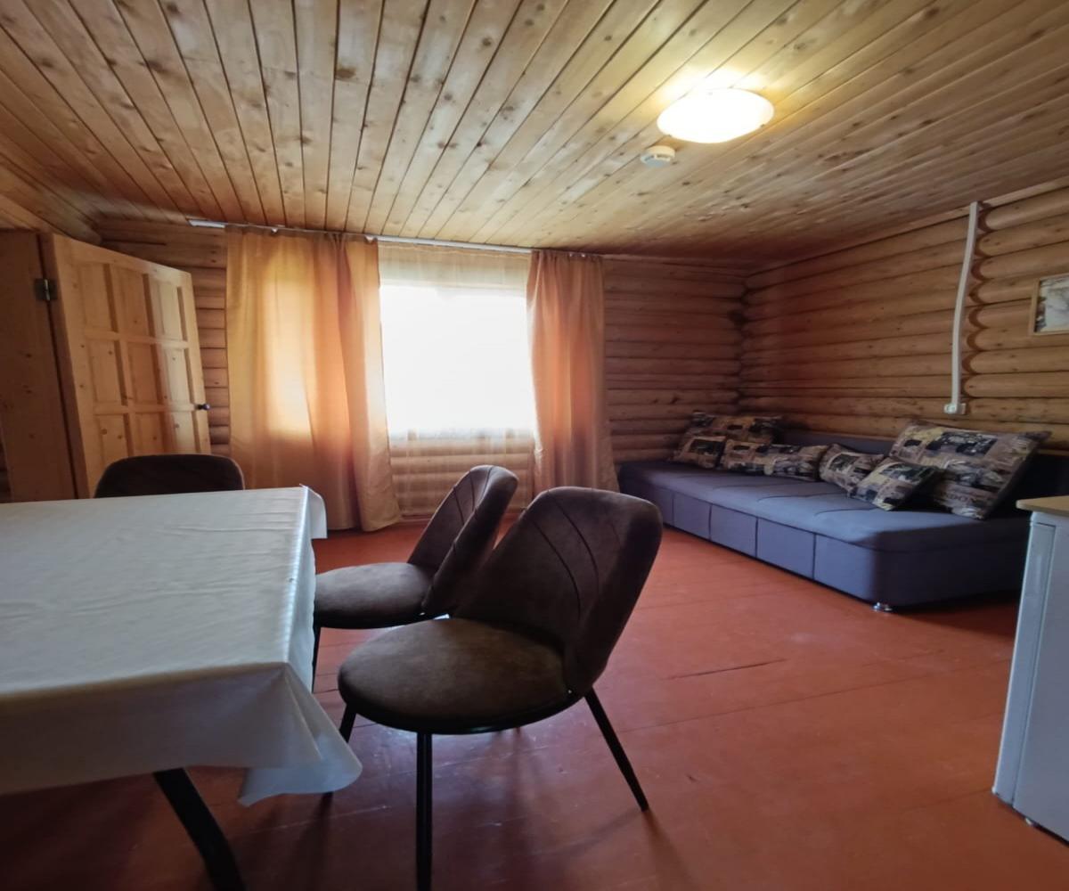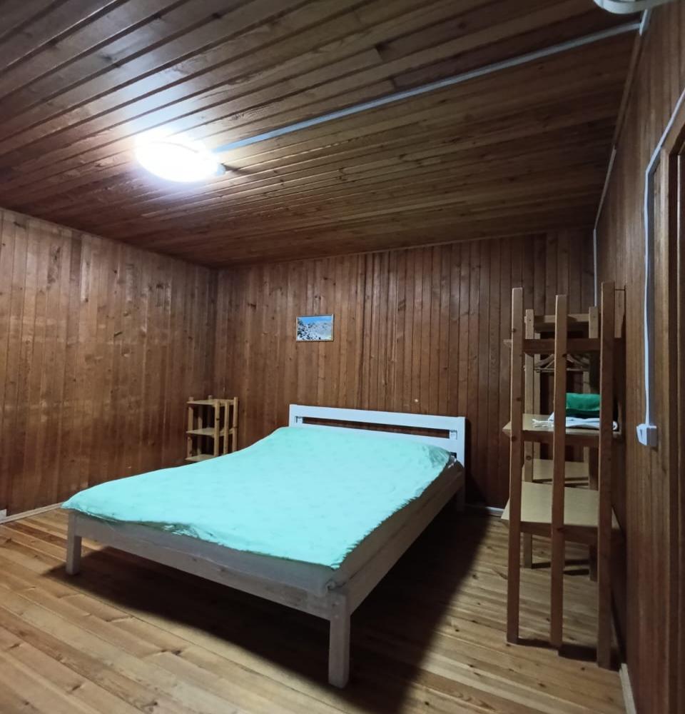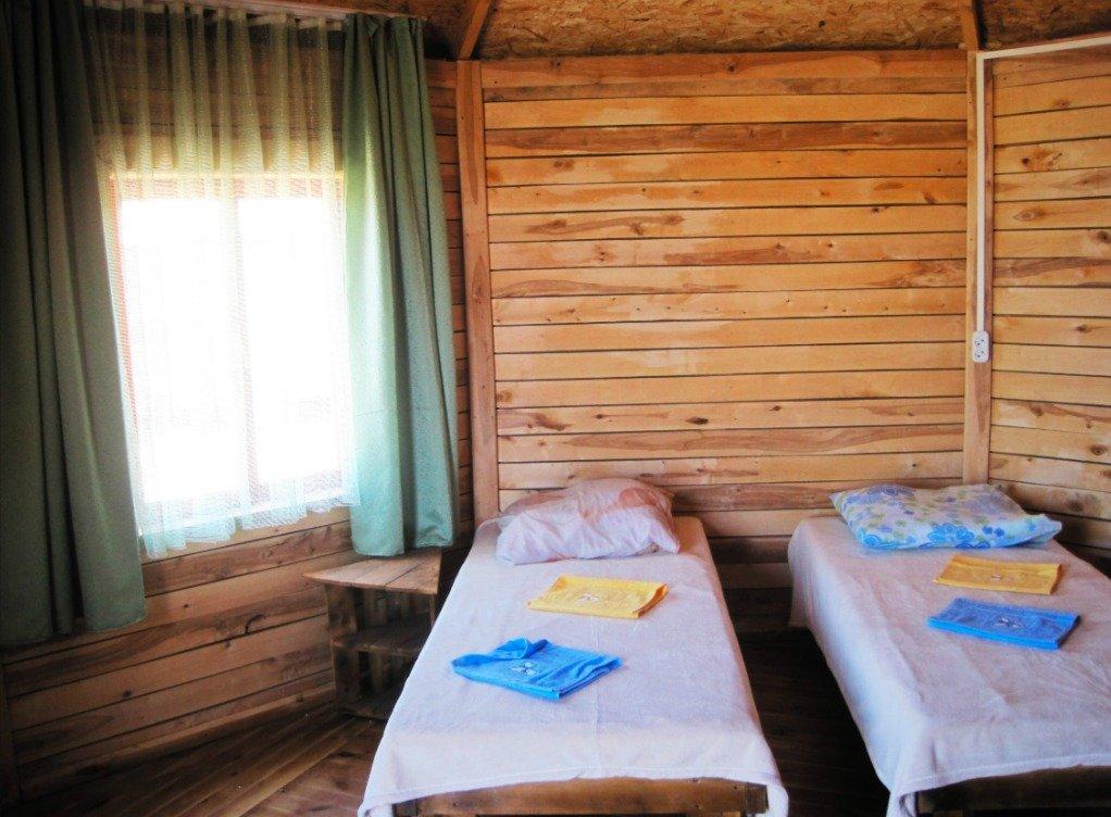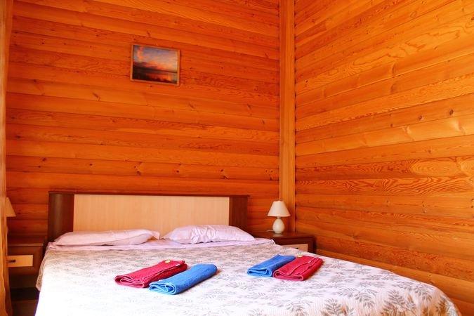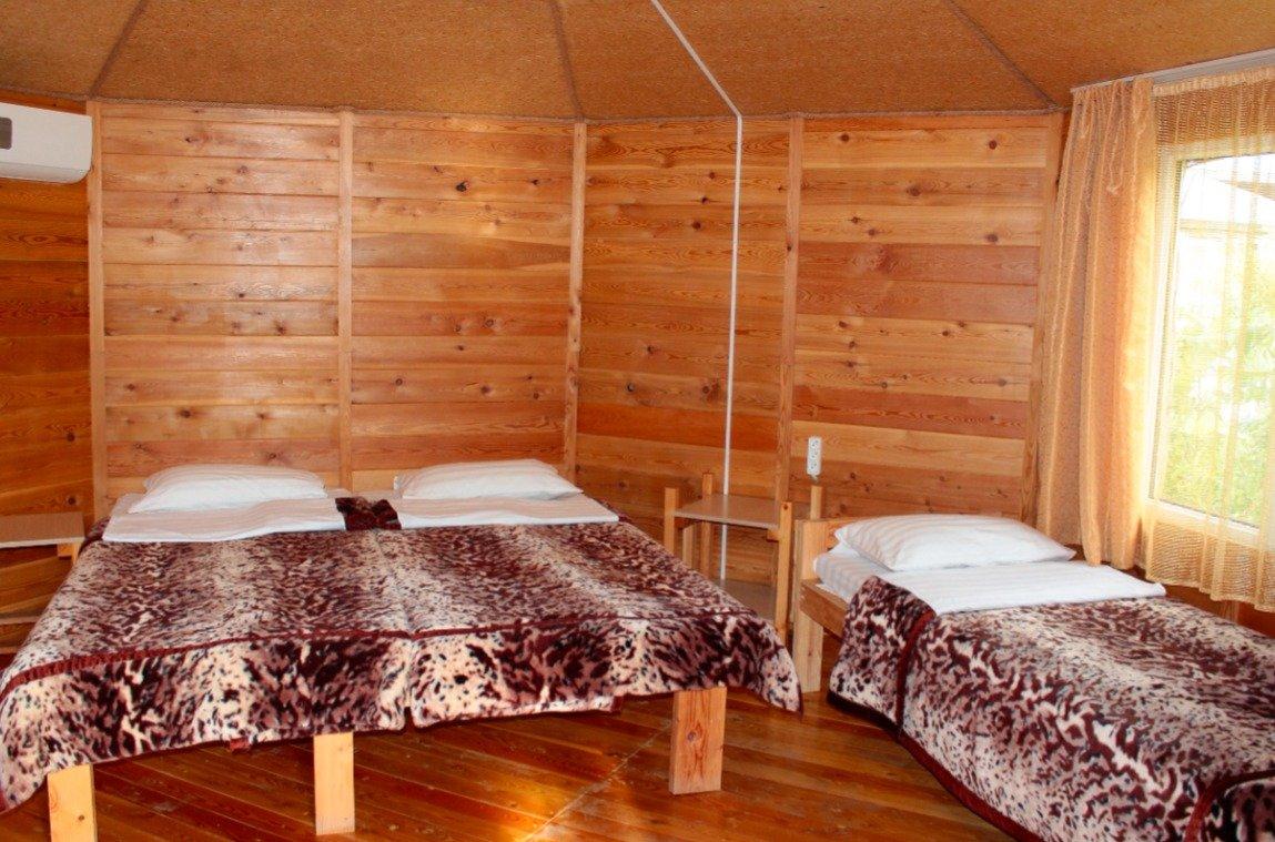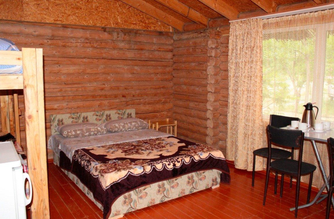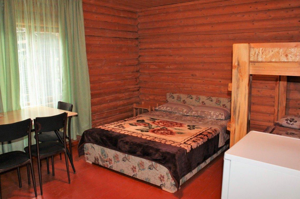 Однокомнатный 4-х местный номер в общем корпусе-срубе с большой просторной террасой и навесом. В номере двуспальная и двухъярусная кровати, холодильник, кондиционер, ТВ, тумба, стол, стулья, набор чайной посуды, термос, шкаф-стеллаж, собственный санузел с душем с отдельным входом на веранде. Дополнительное место не предусмотрено. Площадь номера 45 кв.м., спальни 18 кв.м.