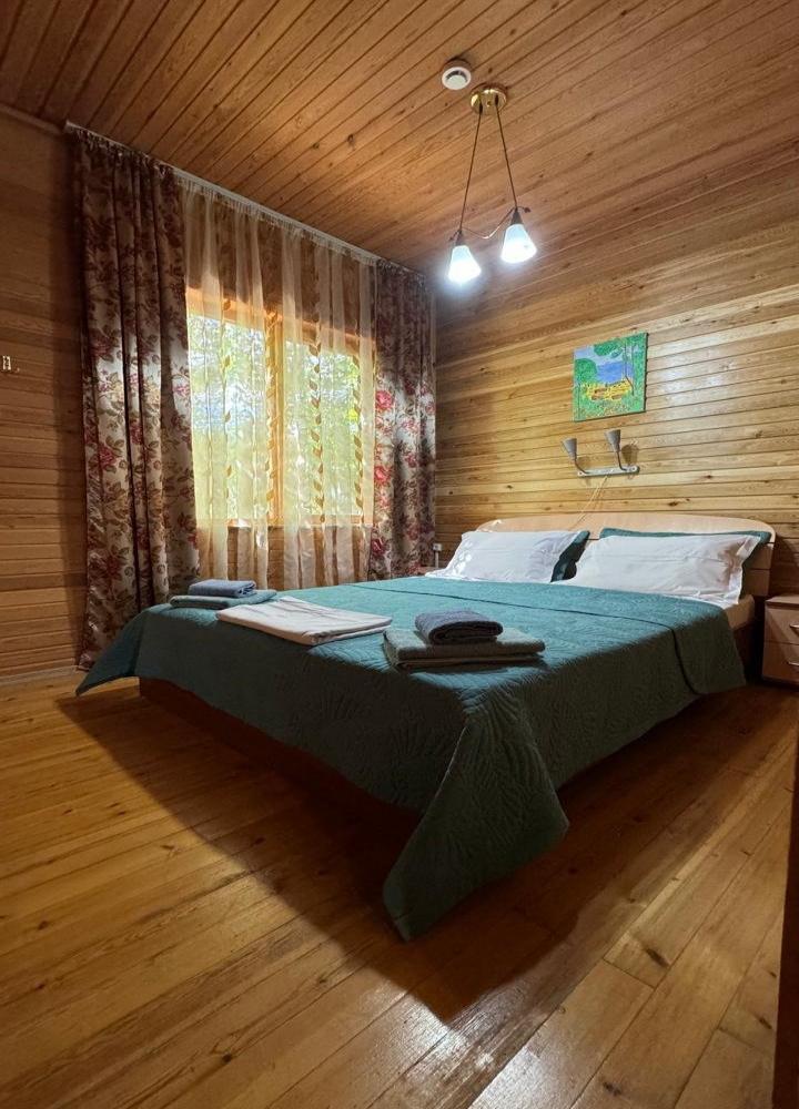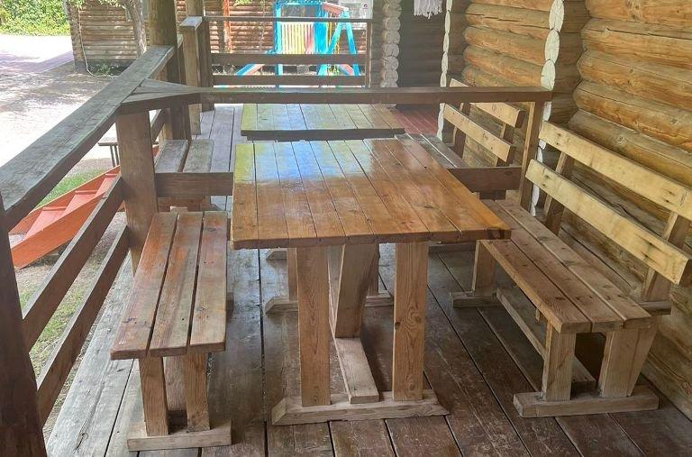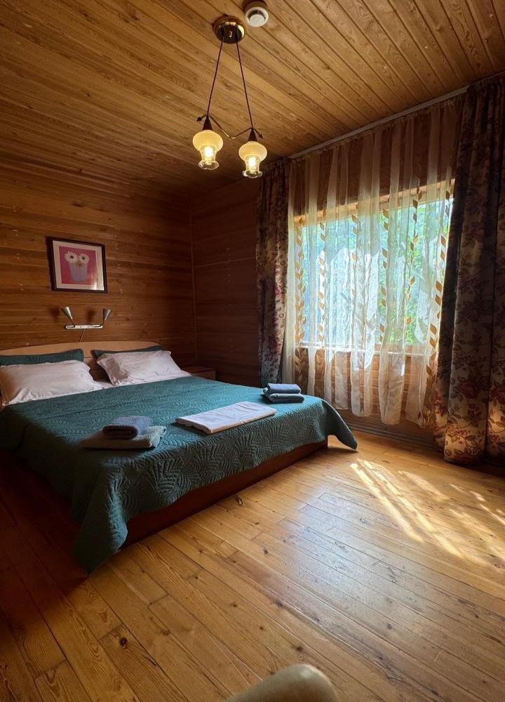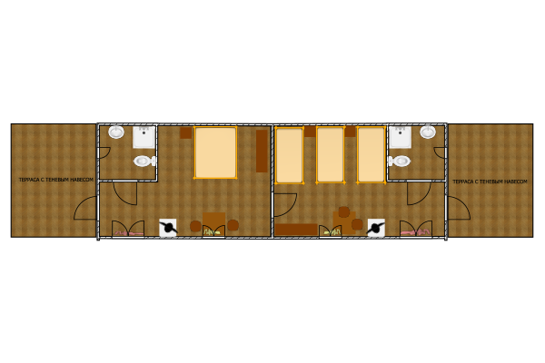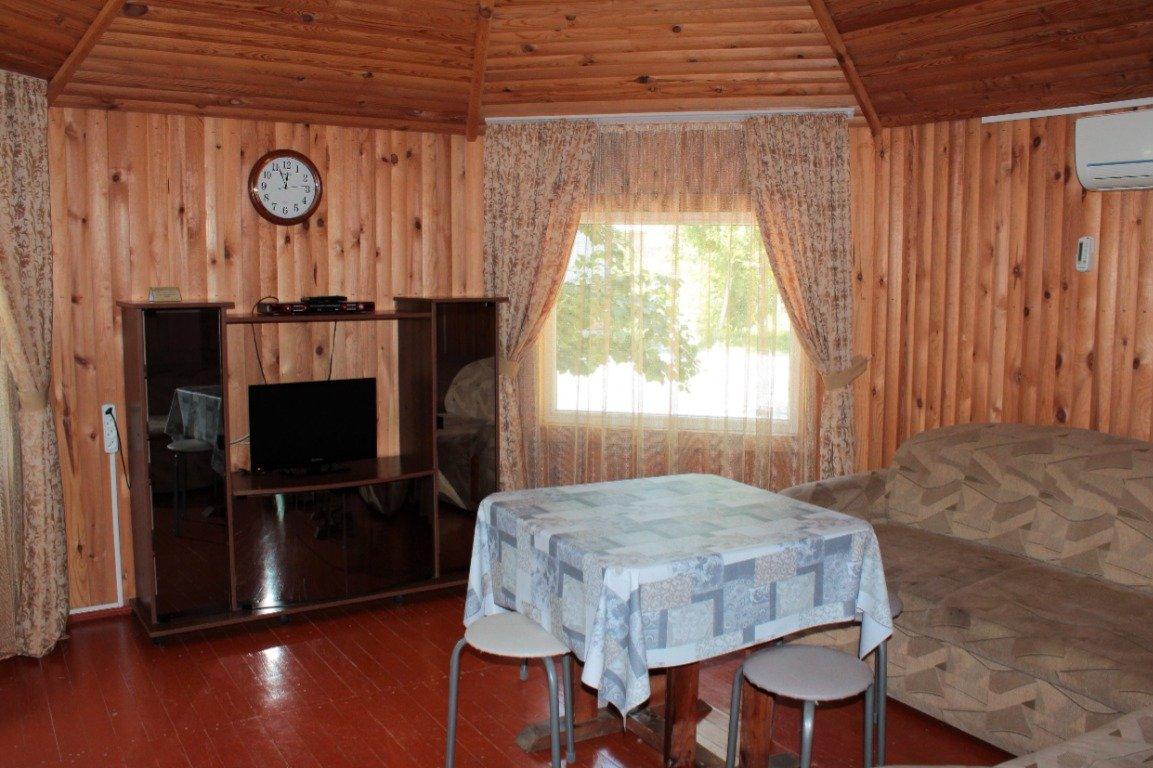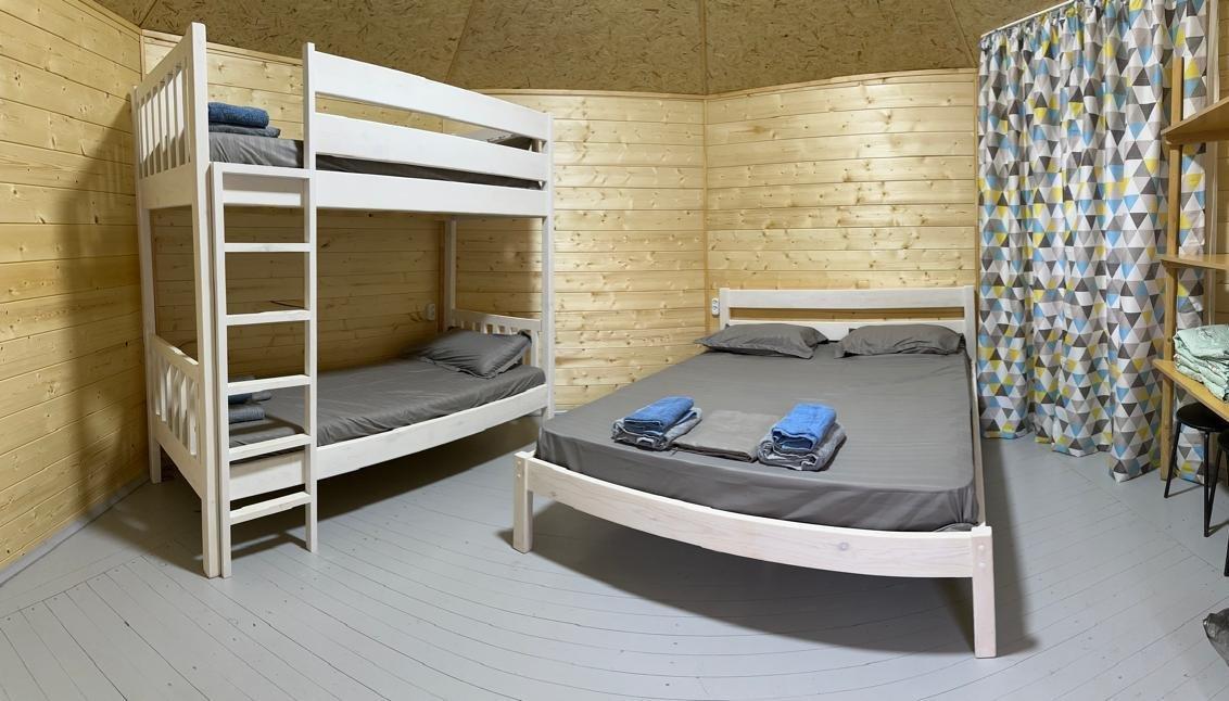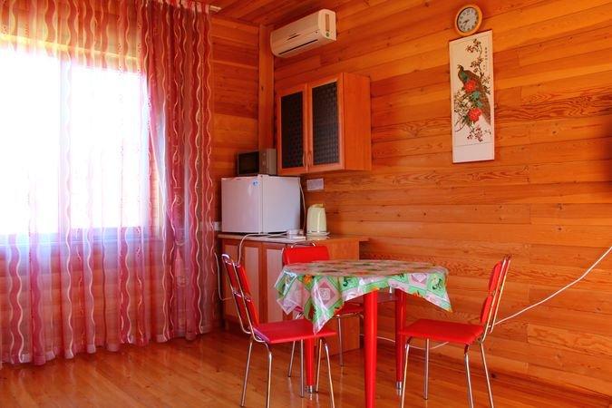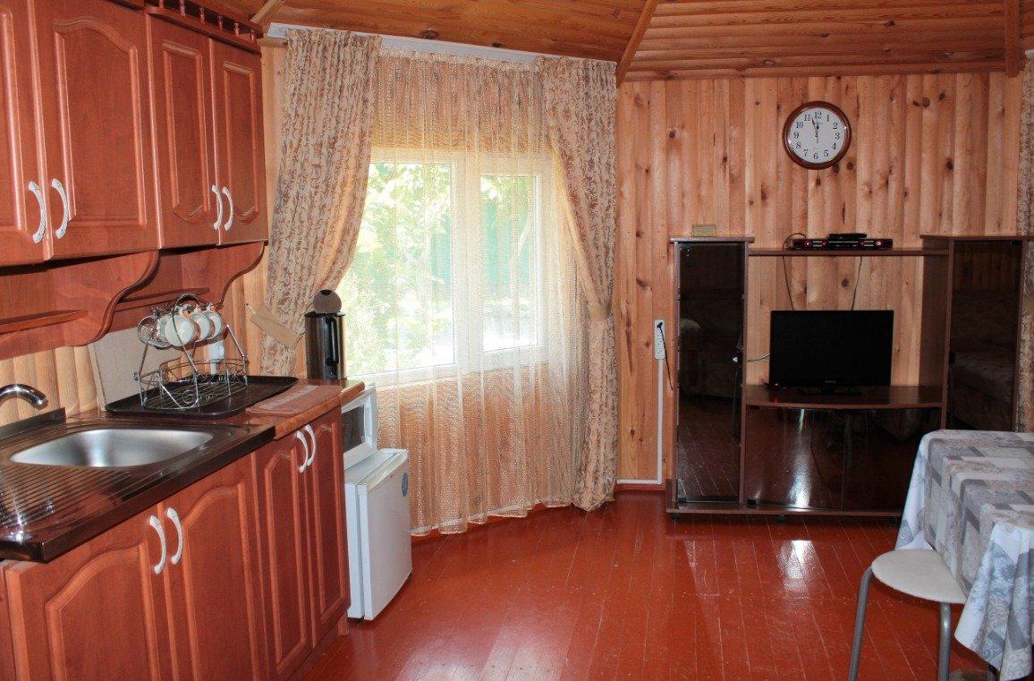 Однокомнатный 4-х местный номер в общем корпусе-срубе с большой просторной террасой и навесом. В номере двуспальная и двухъярусная кровати, холодильник, кондиционер, ТВ, тумба, стол, стулья, набор чайной посуды, термос, шкаф-стеллаж, собственный санузел с душем с отдельным входом на веранде. Дополнительное место не предусмотрено. Площадь номера 45 кв.м., спальни 18 кв.м.
