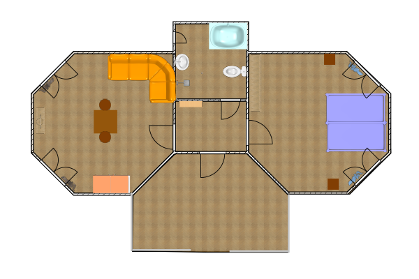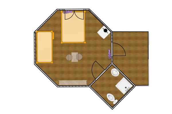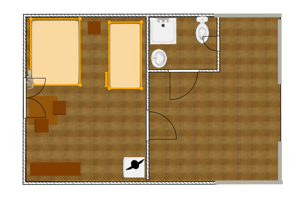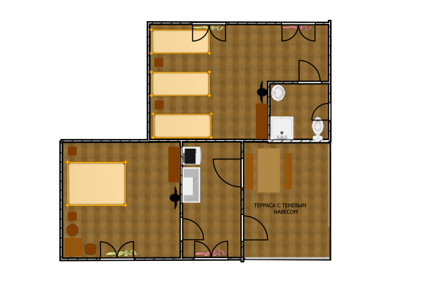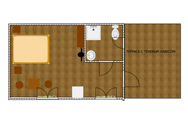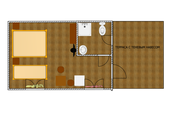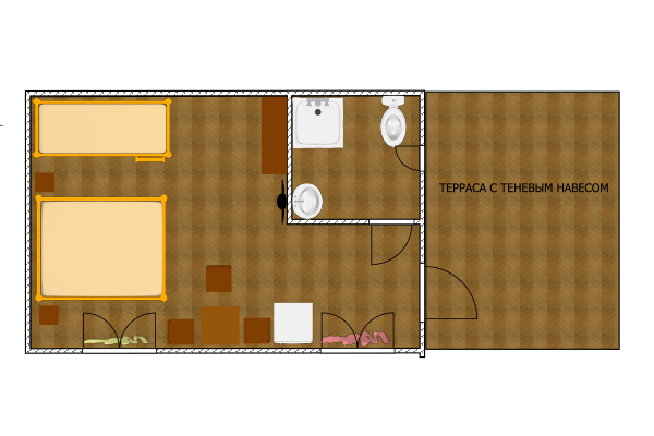 Однокомнатный 3-х местный, отдельно стоящий домик с террасой без навеса. В номере три односпальные кровати (или двуспальная и односпальная кровати), кондиционер, холодильник, ТВ, термос, набор чайной посуды, шкаф-стеллаж, стол, стулья, собственный санузел с душем.