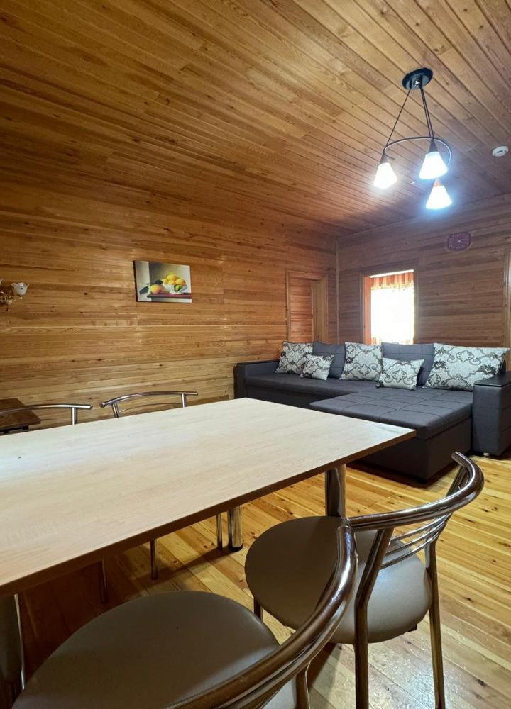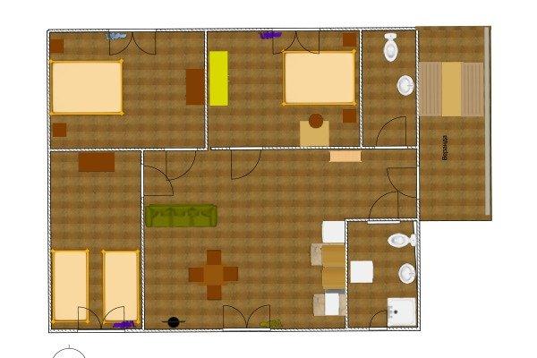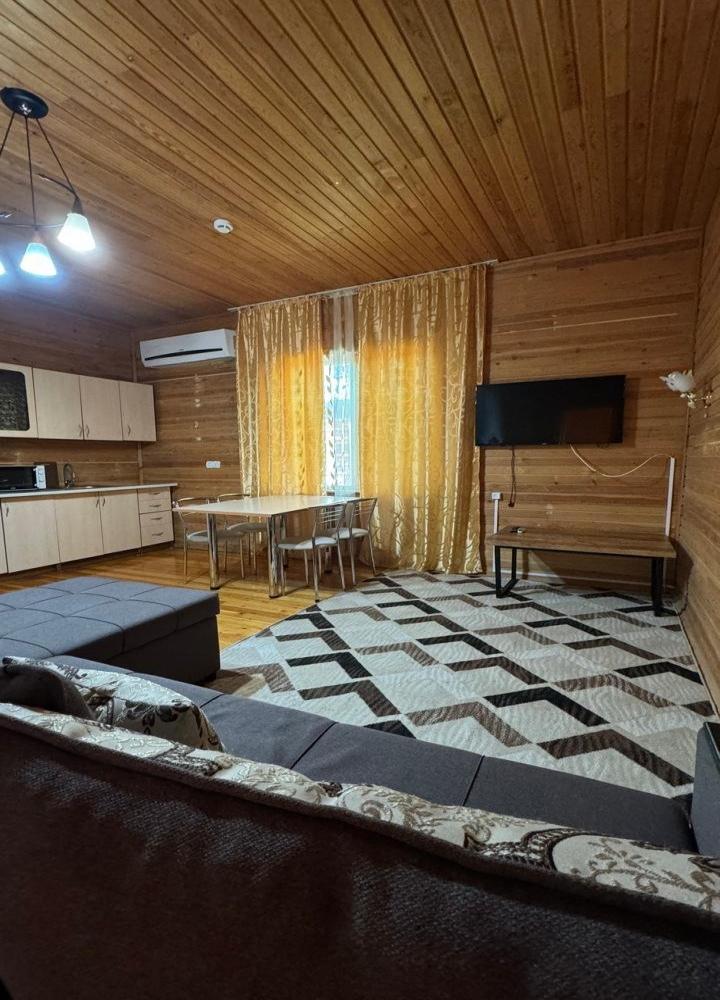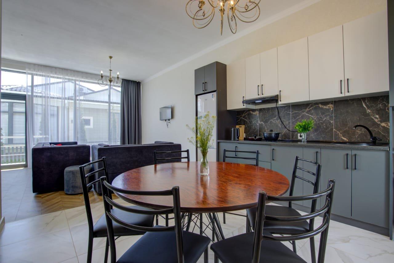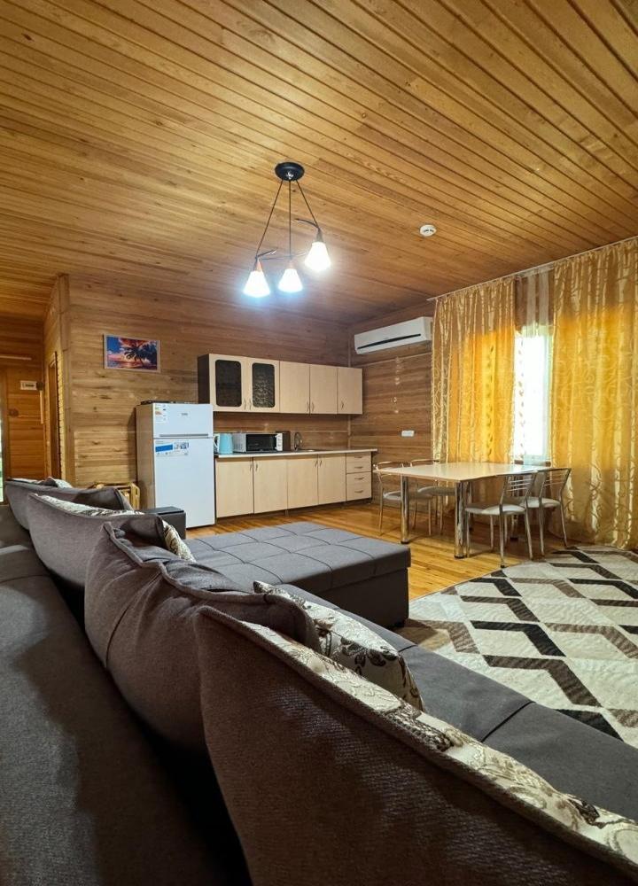 Отдельно стоящий дом из трех спален и просторной гостиной, четырёхкомнатный, 6-ти местный номер с террасой и навесом. В номере: Спальня 1- двуспальная кровать; Спальня 2 — двуспальная кровать; Спальня 3 — две односпальные; Гостиная — диван, кондиционер, большой холодильник, ТВ, СВЧ — печь, кухонный гарнитур, набор столовой и чайной посуды, эл/чайник. Два сан.узла: один санузел с душевой кабиной, унитаз, умывальник, стиральная машина; второй – унитаз и умывальник. В гостиной с мягкой мебелью можно организовать 2 доп. места по 7 000 тенге в сутки за каждое доп. место. Площадь номера — 95 кв.м.