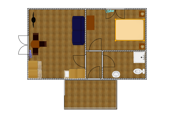 Однокомнатный 2-х местный уютный номер с небольшой прихожей, расположен в корпусе на 4-е номера с террасой и навесом. В номере двуспальная кровать, холодильник, кондиционер, ТВ, тумба, стол, стулья, набор чайной посуды, термос, шкаф-стеллаж, собственный санузел с душем.
