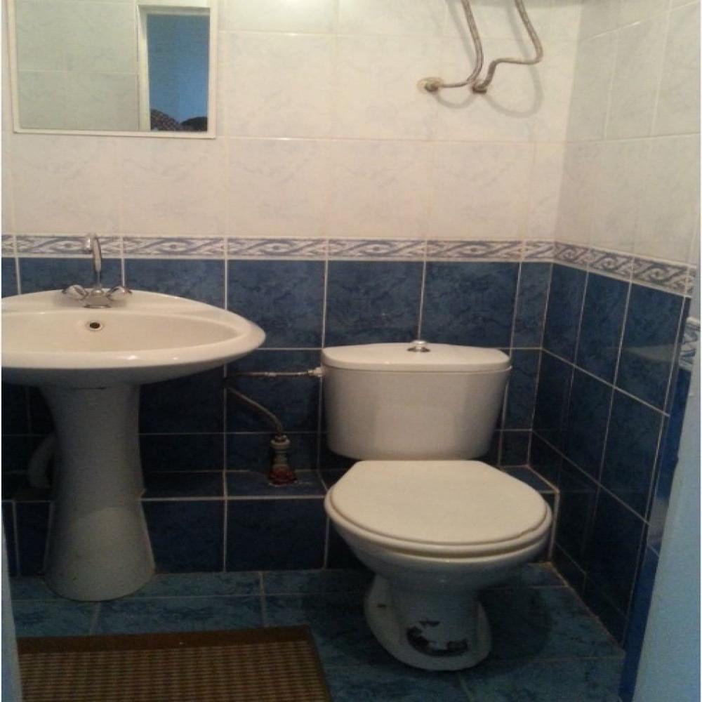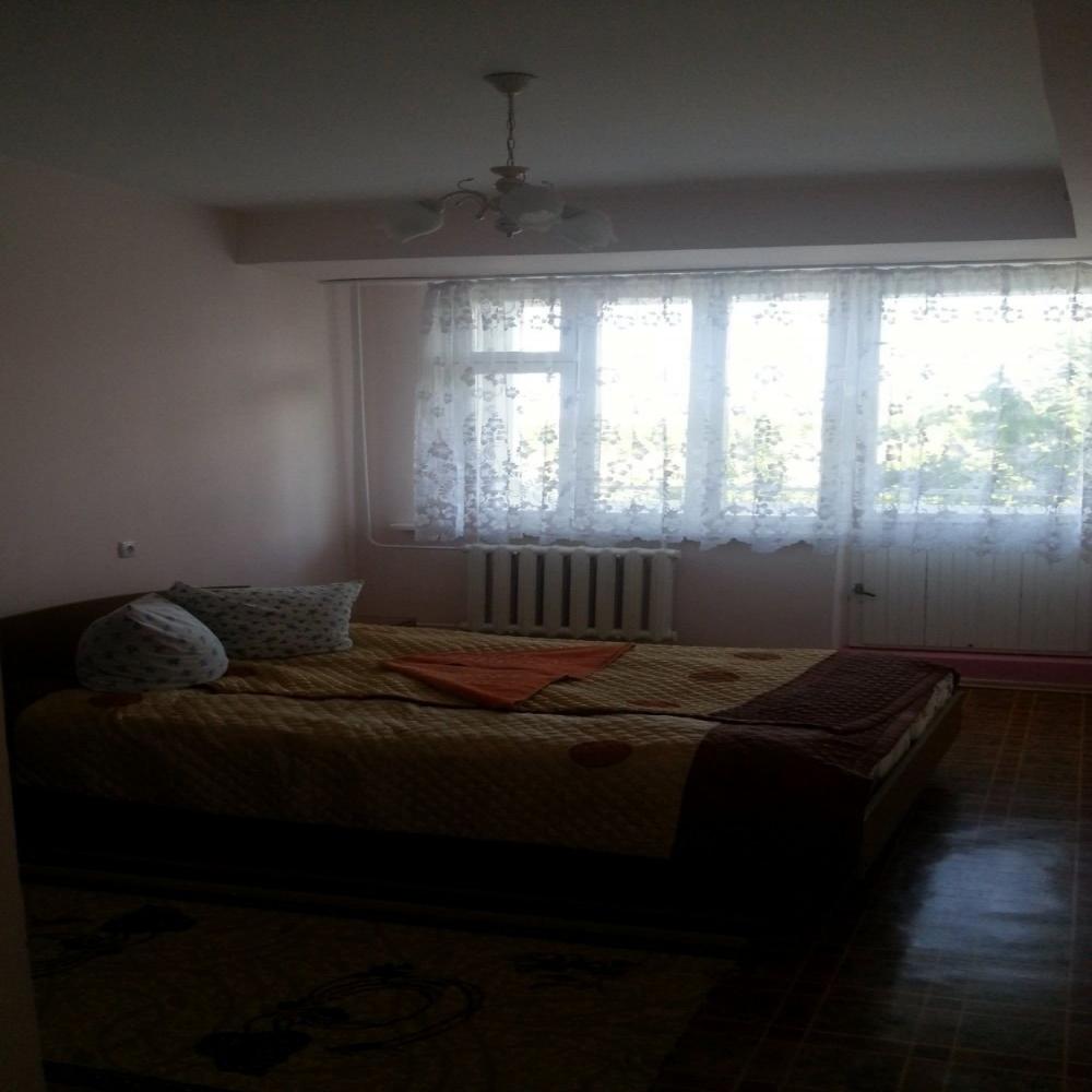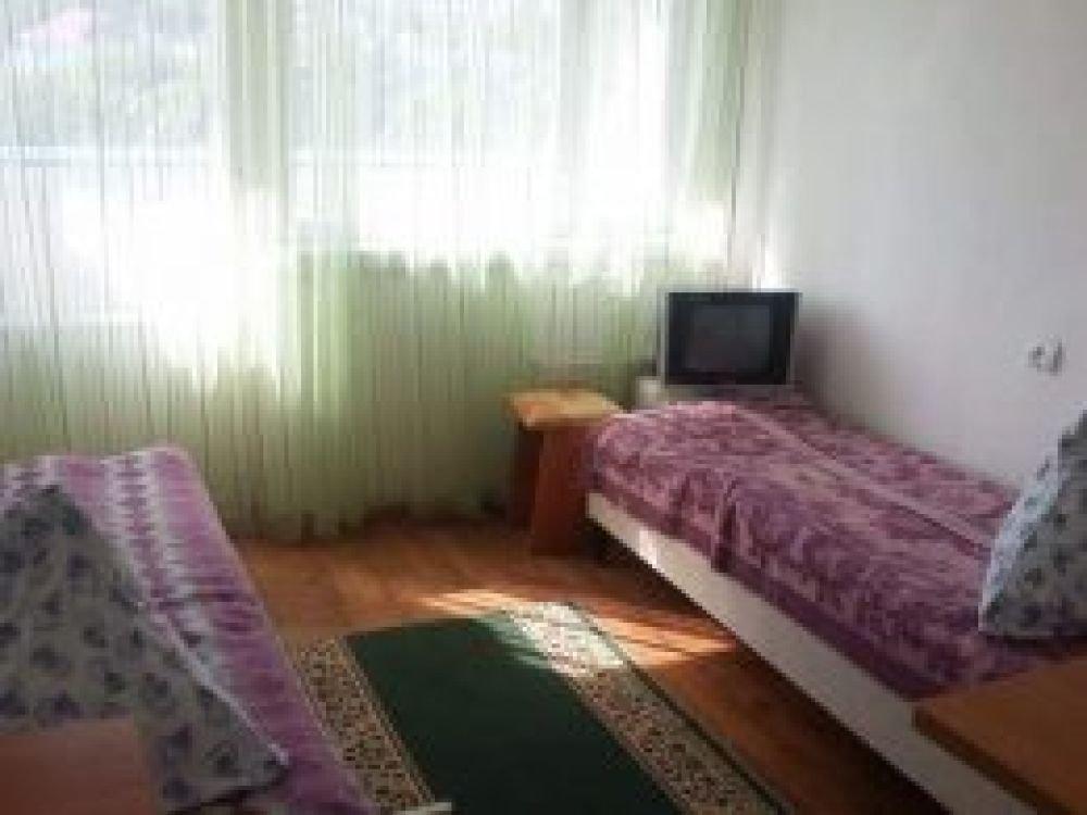 Две комнаты, коридор, 5-ть кроватей односпалок, две в одной комнате, три в другой, прикроватные тумбочки, все номера с балконом, выход на балкон с обеих коинат, туалет и ванная с умывальником отдельно, горячая и холодная вода круглосуточно, вешалка, ТВ, холодильник, стол, табуретки, коврик, стены побелены, занавеска, балкон выходит на озеро (юг).