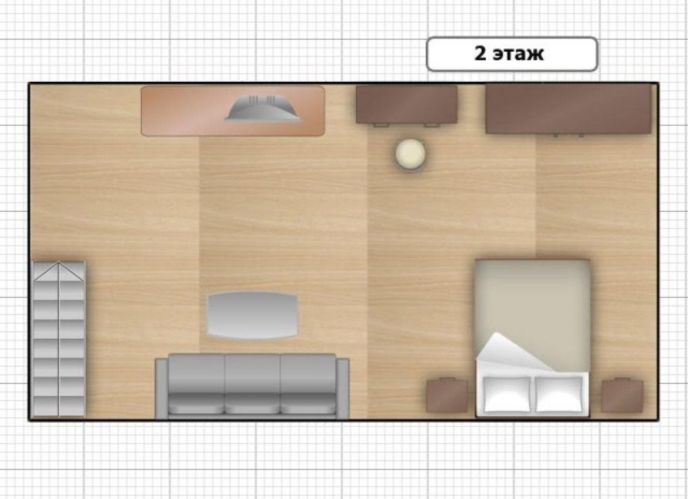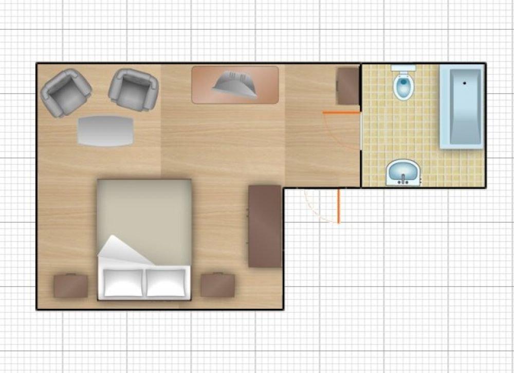 Размер номера с мягким уголком: Спальня: 18 кв.м., Сан. узел: 3,57 кв.м