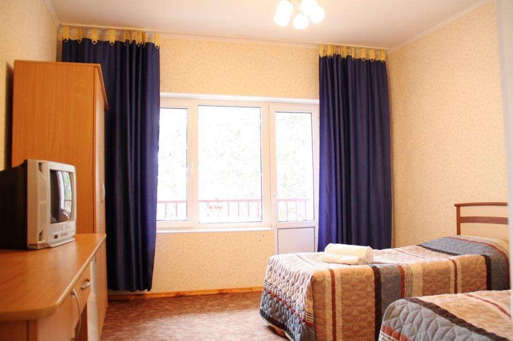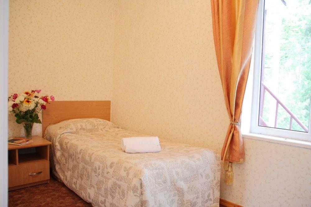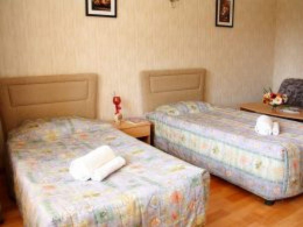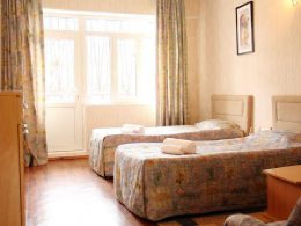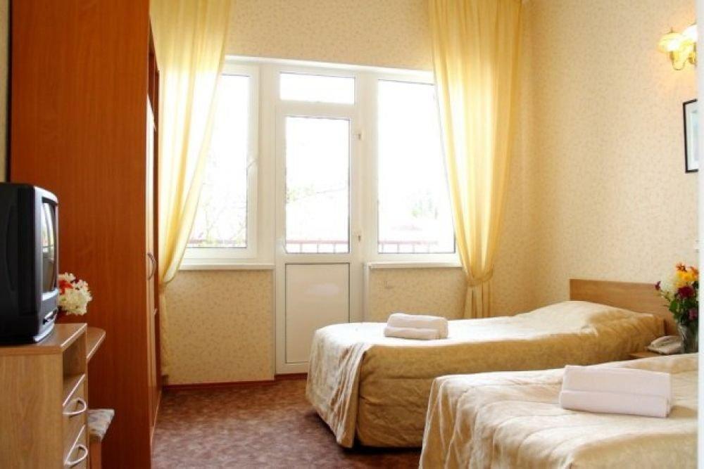 Однокомнатный узкий номер с двумя односпальными кроватями. Номер без балкона, окна выходят на сад.