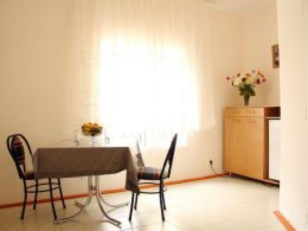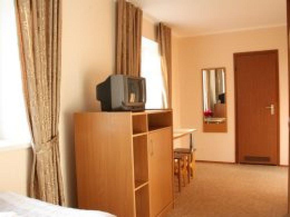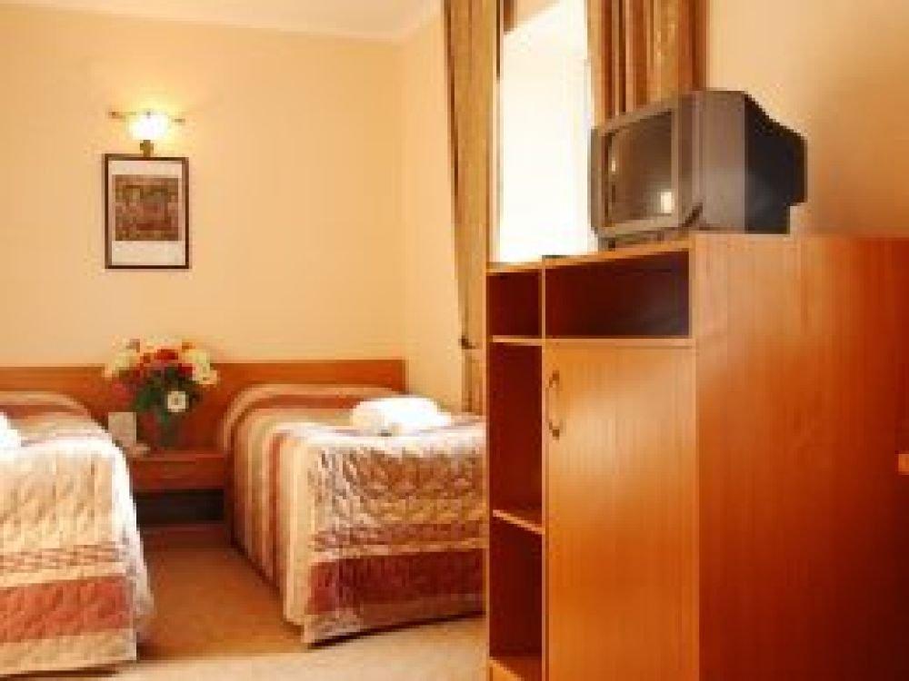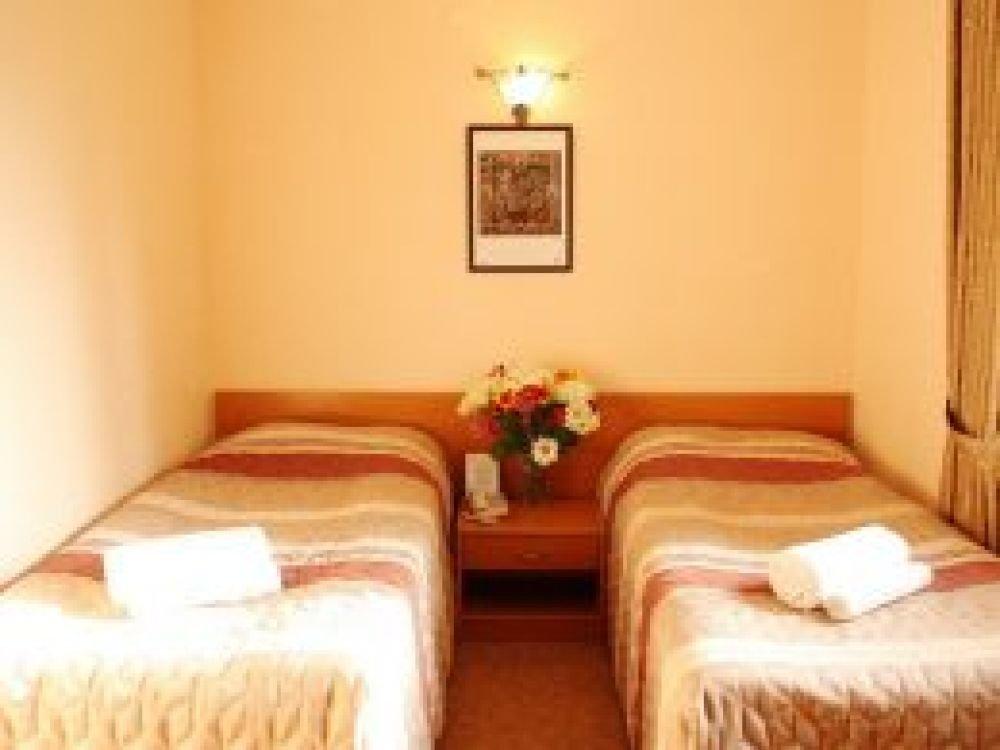 Однокомнатный узкий номер с двумя односпальными кроватями. Номер без балкона, окна выходят на сад.