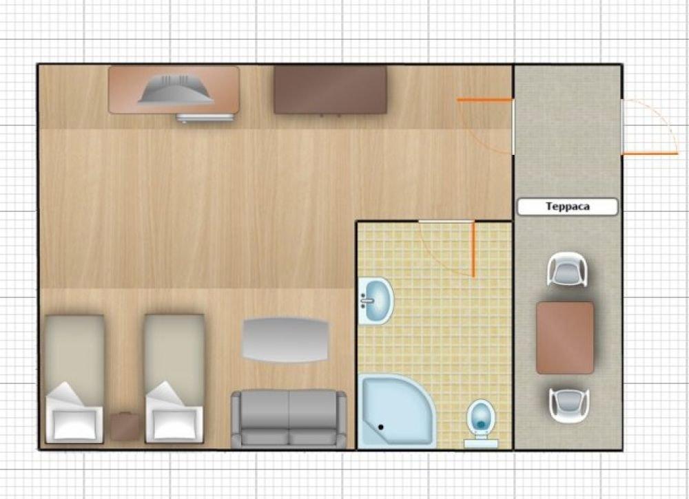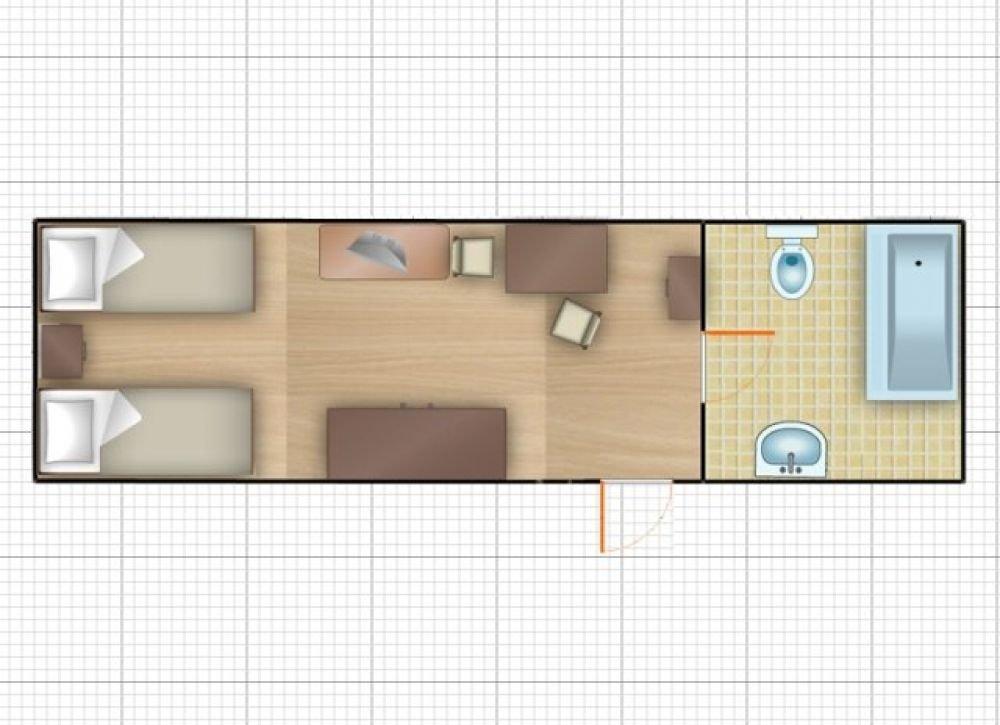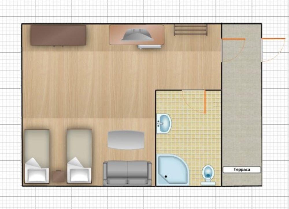 Однокомнатный номер с двумя односпальными кроватями. Номер с балконом или с террасой перед входом.