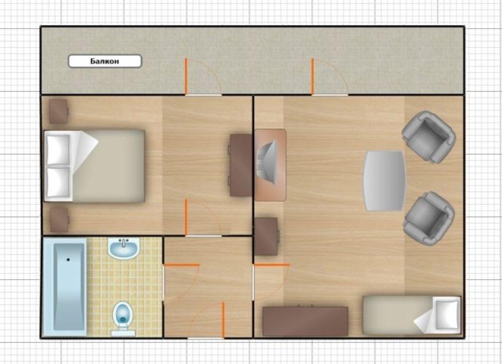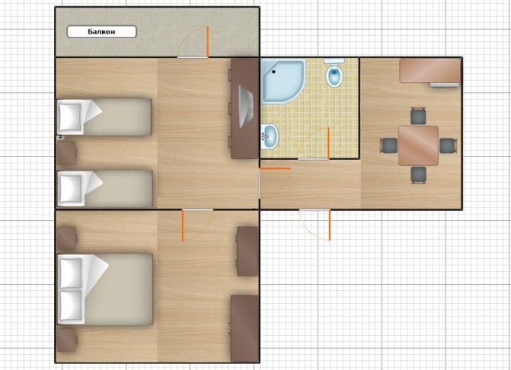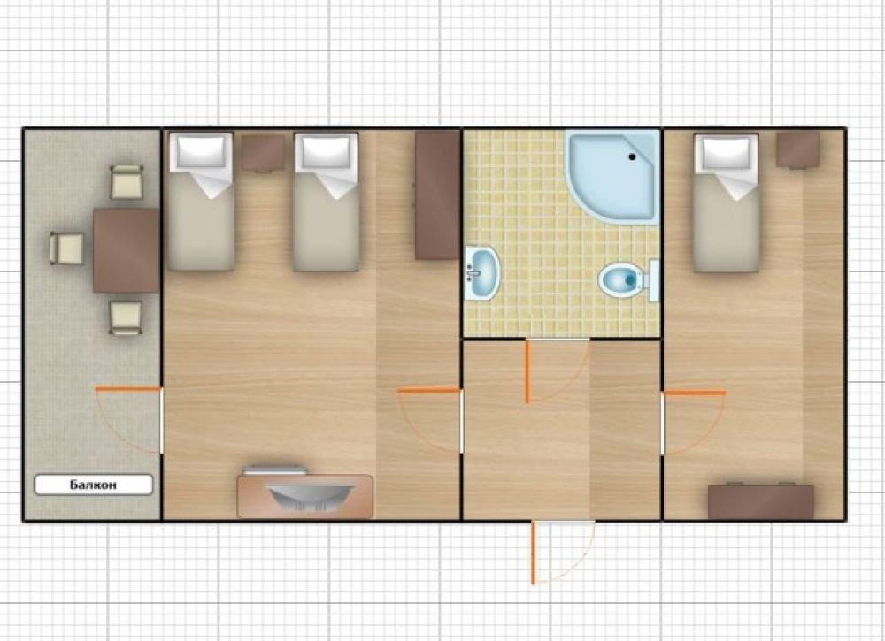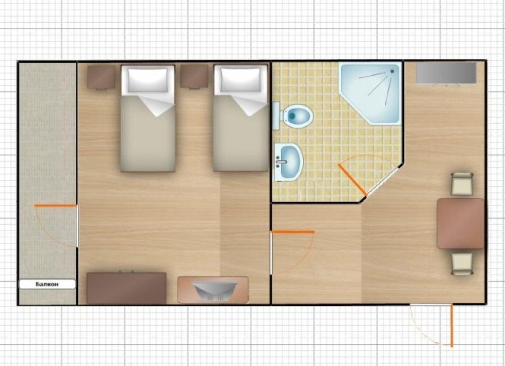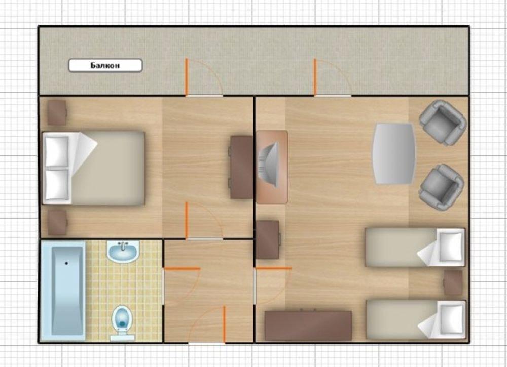 Двухкомнатный номер с балконом, с одной двуспальной и одной односпальной кроватью, либо с тремя односпальными кроватями.