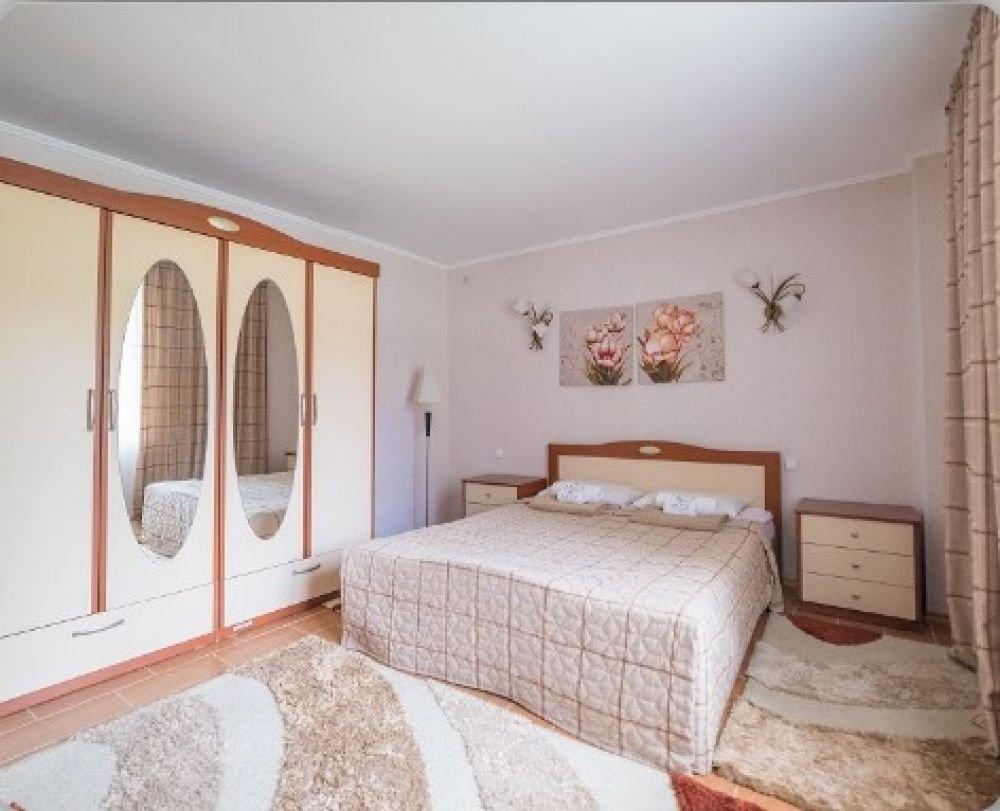 На втором этаже расположена одна спальная комната с двуспальной кроватью или двумя односпальными кроватями. В комнате есть мягкая мебель и телевизор. На первом этаже сан.узел с ванной и гостиная комната с двумя односпальными кроватями, столовым уголком и телевизором.