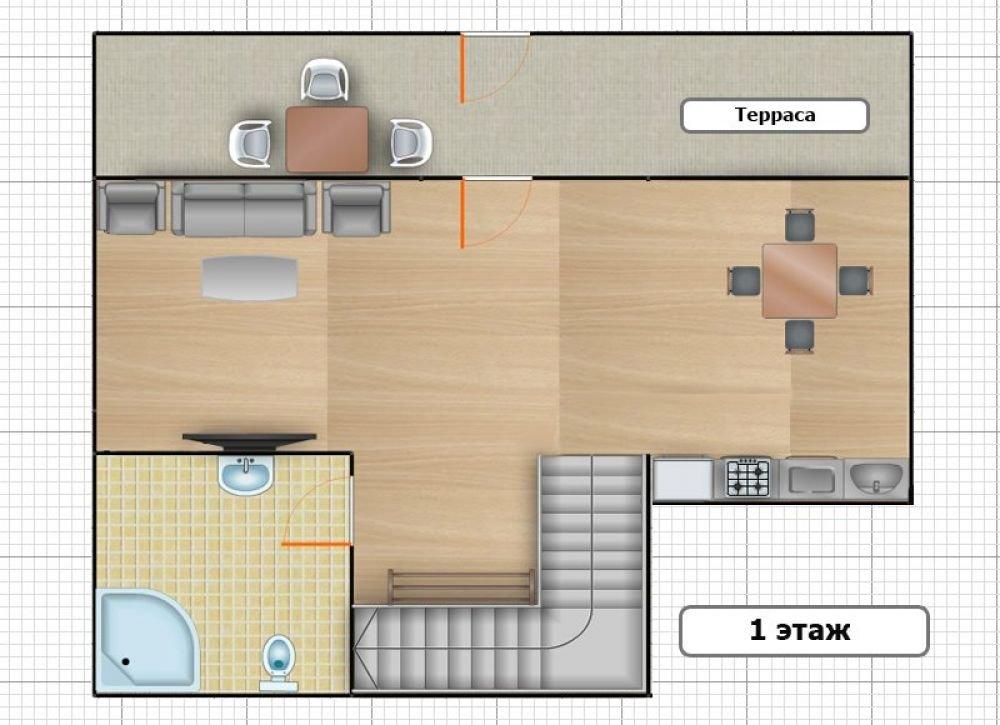 На первом этаже расположены гостиная комната, кухня, сан.узел с душем. На втором этаже три спальные комнаты и сан.узел с душем. В одной спальной комнате двуспальная кровать, во второй – две односпальные кровати и в третьей - одна односпальная кровать.