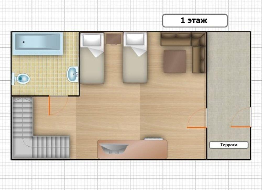 Размер номеров с террасой (1 этаж): Спальня: 23,46 кв.м., Сан. узел: 3,3 кв.м, Терраса: 7,5 кв.м.